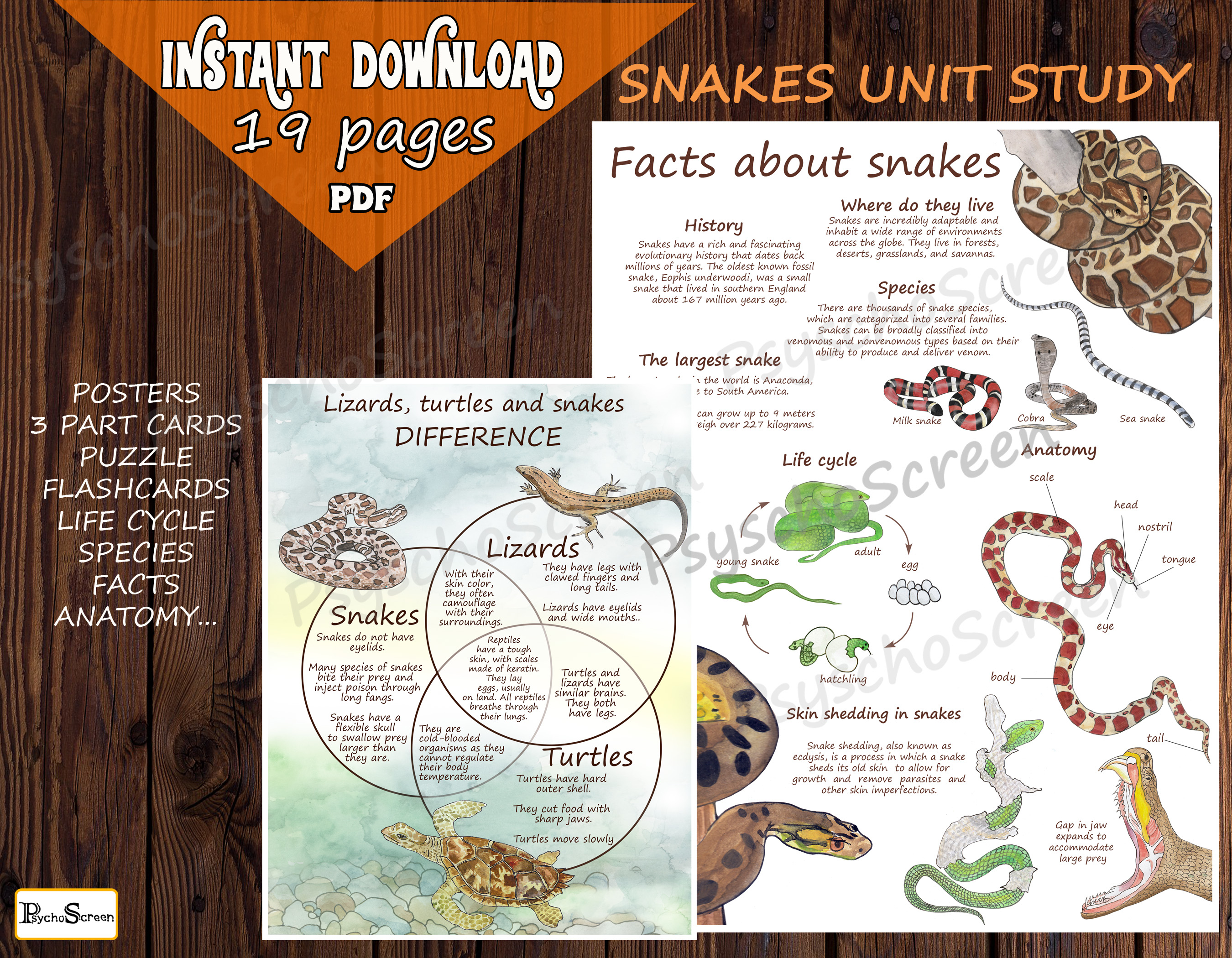 Printable PDF snakes bundle with Anatomy, Diagram, Life cycle, Flashcards, Posters and Puzzles