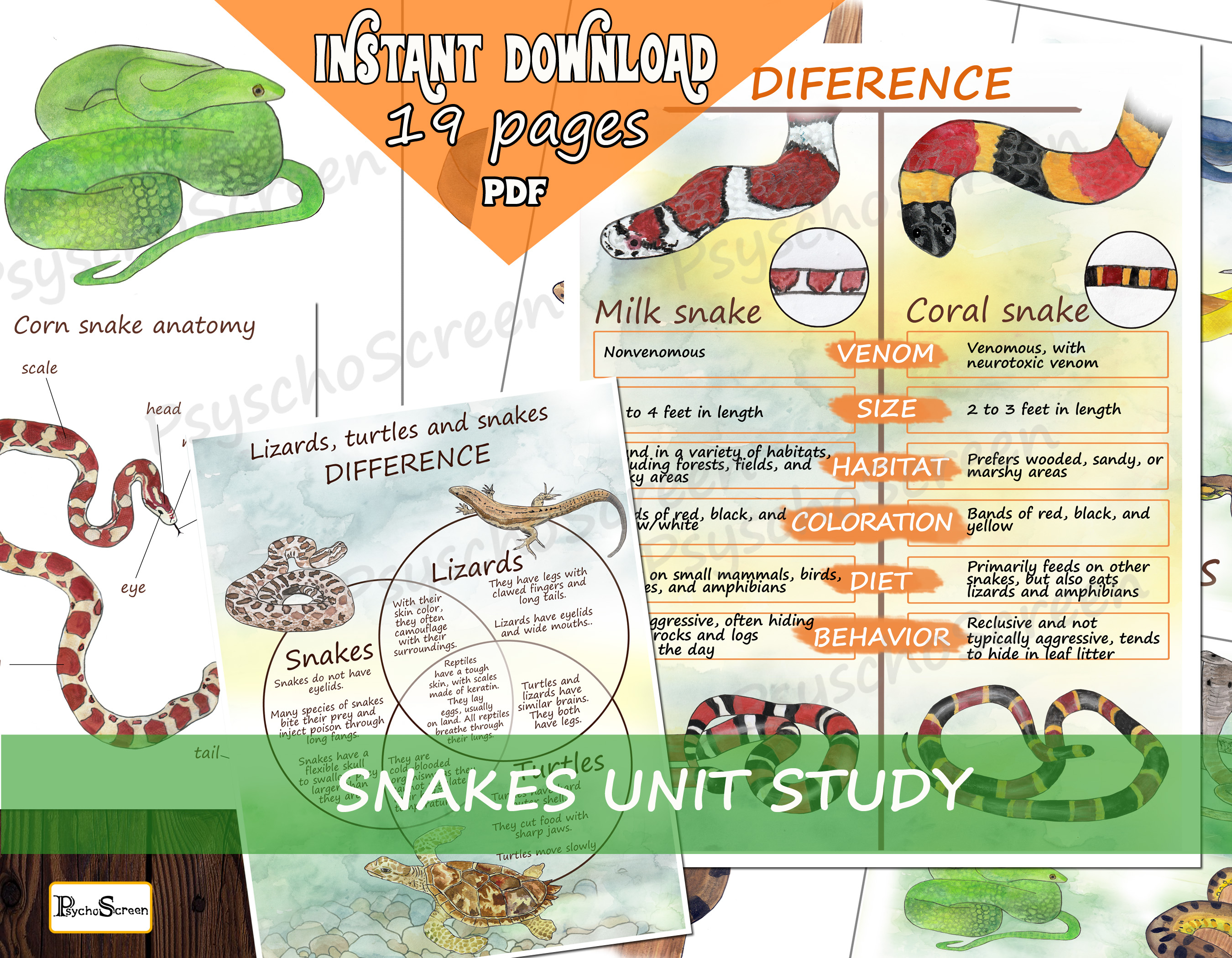 Get ready to immerse yourself in the study of our cold-blooded friends, snakes, with this exclusive bundle. The package features intricate diagrams, anatomy visuals, and a detailed look at the snake life cycle. Alongside these, you'll find flashcards and posters to aid retention and keep the learning process engaging. Additionally, a puzzle included in this snake unit study keeps things fun and interactive. Each piece in this bundle is a printable document, easy to access and use at any time, any place. The illustrations are lifelike, colorful, and designed to stimulate curiosity. Whether you're exploring the wonders of nature or incorporating fascinating creatures into your study plan, this printable snake unit study bundle is the perfect tool.